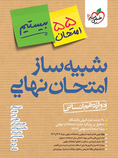 کتابهای شبیه ساز امتحان نهایی با هدف شبیه سازی امتحانات نهایی آماده شده است. با توجه به افزایش اهمیت امتحانات نهایی و تاثیر 50 درصدی در سال اول و 60 درصدی از سال بعد در نمره قبولی دانشگاه، این محصول اهمیت فوق العاده ای دارد. امتحانات نهایی مفهومی تر و سخت تر شده اند و صرفا بررسی امتحانات سال های گذشته نمیتواند کافی باشد و نیاز به مجموعه ای که با رویکرد جدید تالیف شده باشد کاملا احساس می شود. این کتاب ها به صورت پک دارای 2 کتاب می باشند. 1- جلد آزمون و 2- جلد پاسخ. ویژگی جلد آزمون: همه دروس نهایی پایه دوازدهم در یک کتاب - طراحی شده بر اساس رویکرد جدید امتحانات نهایی - ارائه 5 آزمون شبیه ساز و نهایی در هر درس - ارائه 50 آزمون شبیه ساز نهایی در کل کتاب – ارائه 10 دوره آزمون به صورت QR - ارائه آزمون های چالشی جهت آمادگی برای امتحانات دشوارتر - مطابق با آخرین تغییرات کتاب درسی و بارم بندی امتحانات نهایی - ارائه جدول بارم بندی، مشاوره و تحلیل امتحانات نهایی - شباهت حداکثری ظاهر آزمون ها با امتحانات نهایی - پرفراژ آزمون ها برای استفاده راحت تر و شبیه سازی کامل تر - ارائه آزمون های شبیه ساز با پوشش حداکثری کتاب درسی ویژگی جلد پاسخ: ارائه پاسخ نامه تشریحی برای کلیه آزمون ها - ارائه ریز بارم بندی جهت آشنایی با نحوه تصحیح اوراق امتحانی - ارائه توضیحات اضافه یا نکته یا درسنامه در صورت نیاز - همراه با ضمیمه "امتحانت را قورت بده" حاوی اطلاعات مشاوره ای